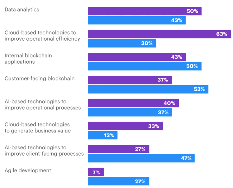 Another important hurdle to address is related to the workforce. Ninety percent of insurers expect digital innovation to cause a significant headcount reduction. These concerns also stand in the way of digital transformation across financial services, yet four in 10 insurers expect their technology investments to improve employee retention and satisfaction, reducing turnover.